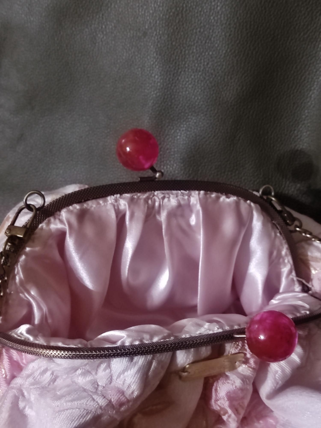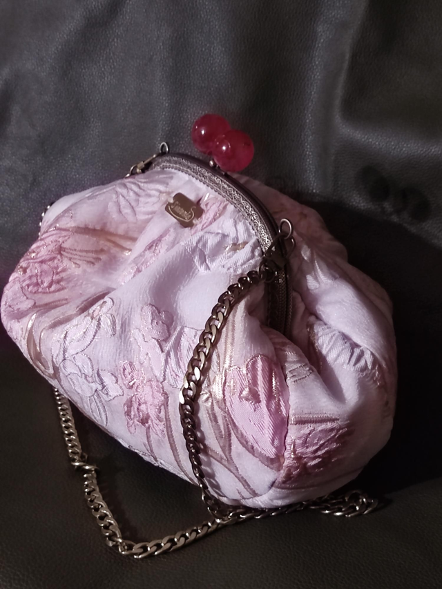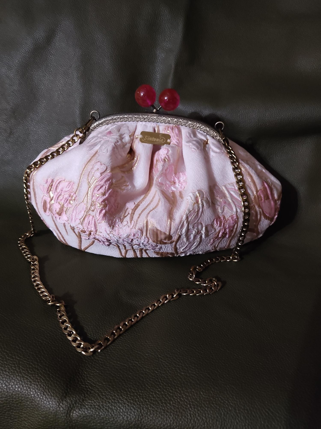 Borsa realizzata a mano con tessuti selezionati con estrema cura, tracolla removibile in metallo, interno foderato in raso elegante con comodo taschino.