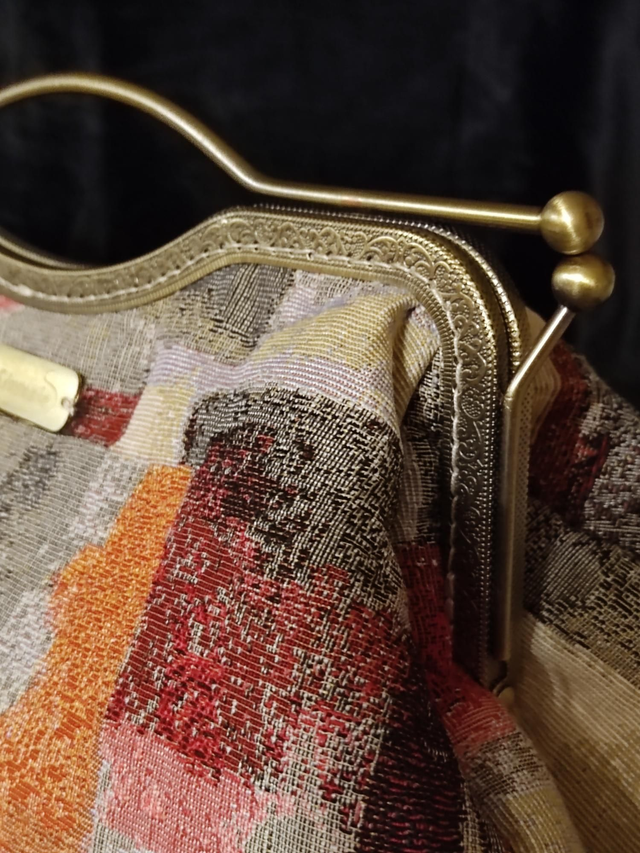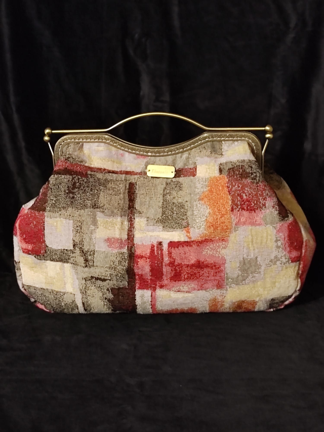 Borsa realizzata a mano con tessuti selezionati con estrema cura, tracolla removibile in metallo, interno in raso elegante con comodo taschino.