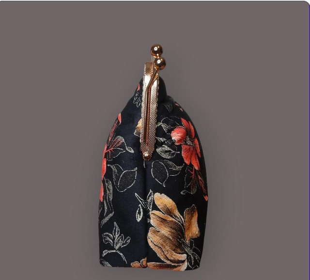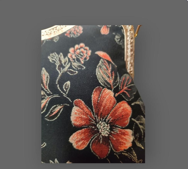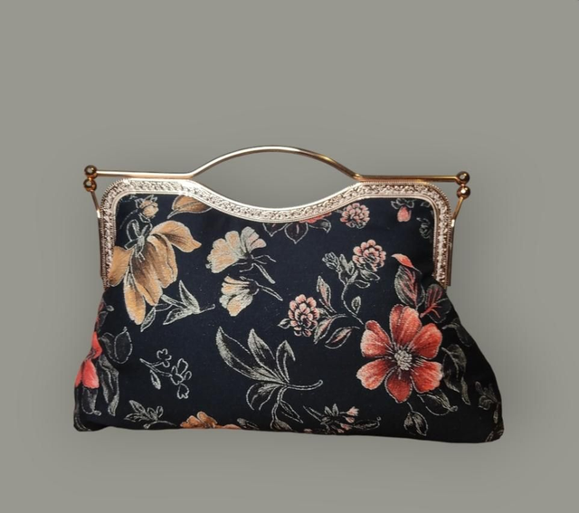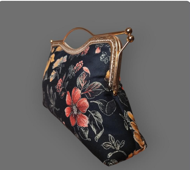 Borsa realizzata a mano con tessuti selezionati con estrema cura, tracolla removibile in metallo, interno foderato in raso elegante con comodo taschino.