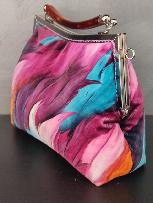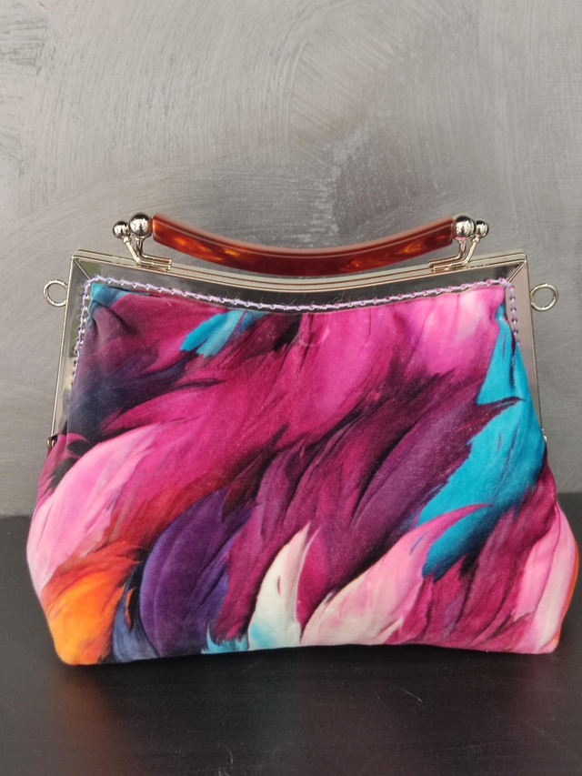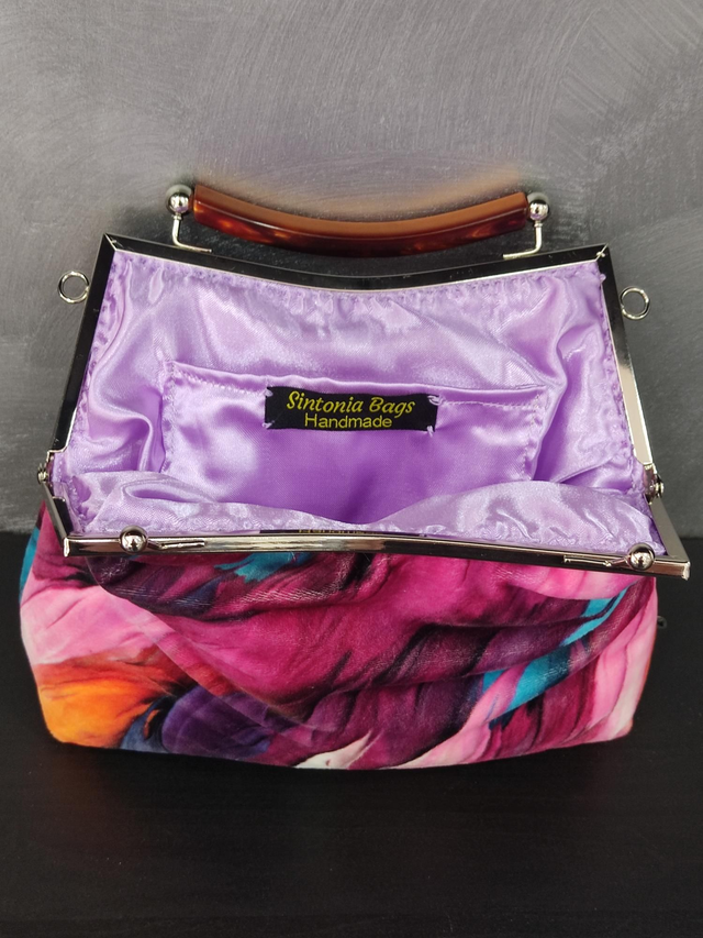 Borsa realizzata a mano con tessuti selezionati con estrema cura, tracolla removibile in metallo interno in raso elegante con comodo taschino.